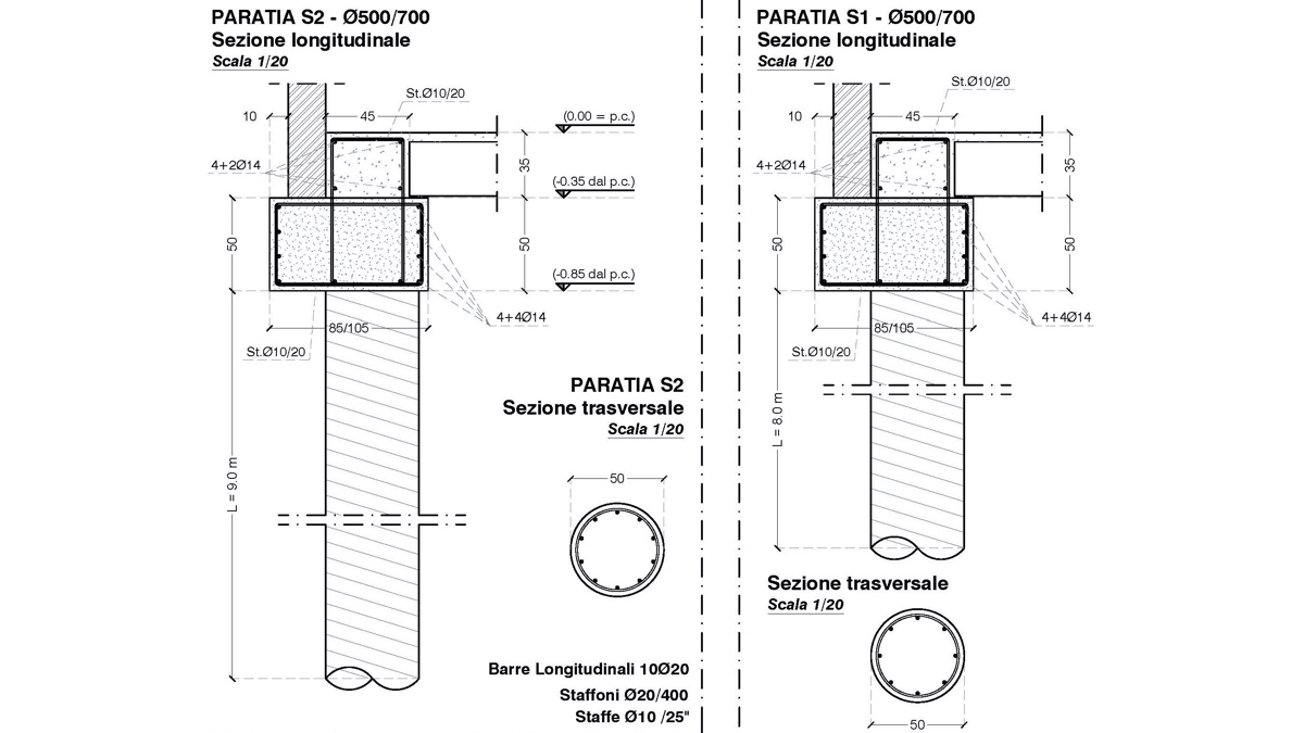 Per la realizzazione del volume parzialmente interrato, i cui confini sono adiacenti al confine del lotto, è stato necessario progettare una rampa in c.a.o. ed un sistema di sostegno perimetrale per equilibrare le spinte del sistema stradale e degli edifici confinanti; la struttura è stata realizzata, sui tre lati perimetrali, mediante una palificata ad andamento altimetrico variabile sormontata da un cordolo su cui è poggiato, con un vincolo scorrevole, il primo implacato; mentre sul lato libero del lotto, l’elemento di contenimento è realizzato mediante un setto in c.a.o. a mensola.